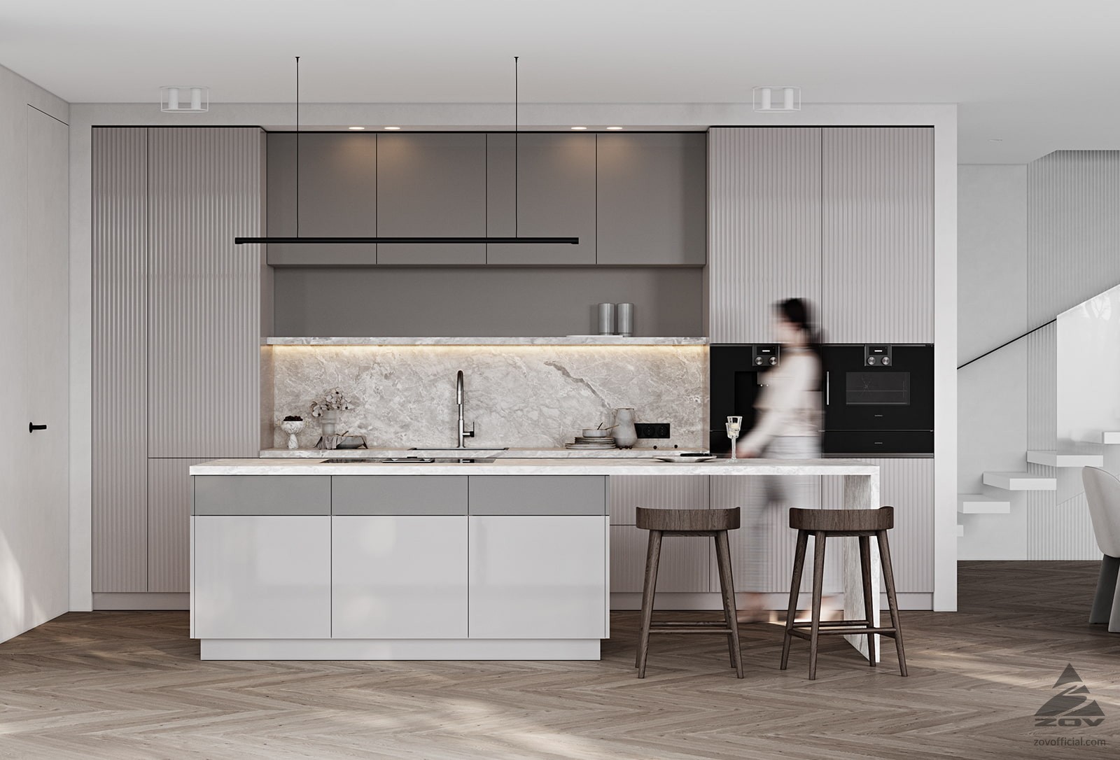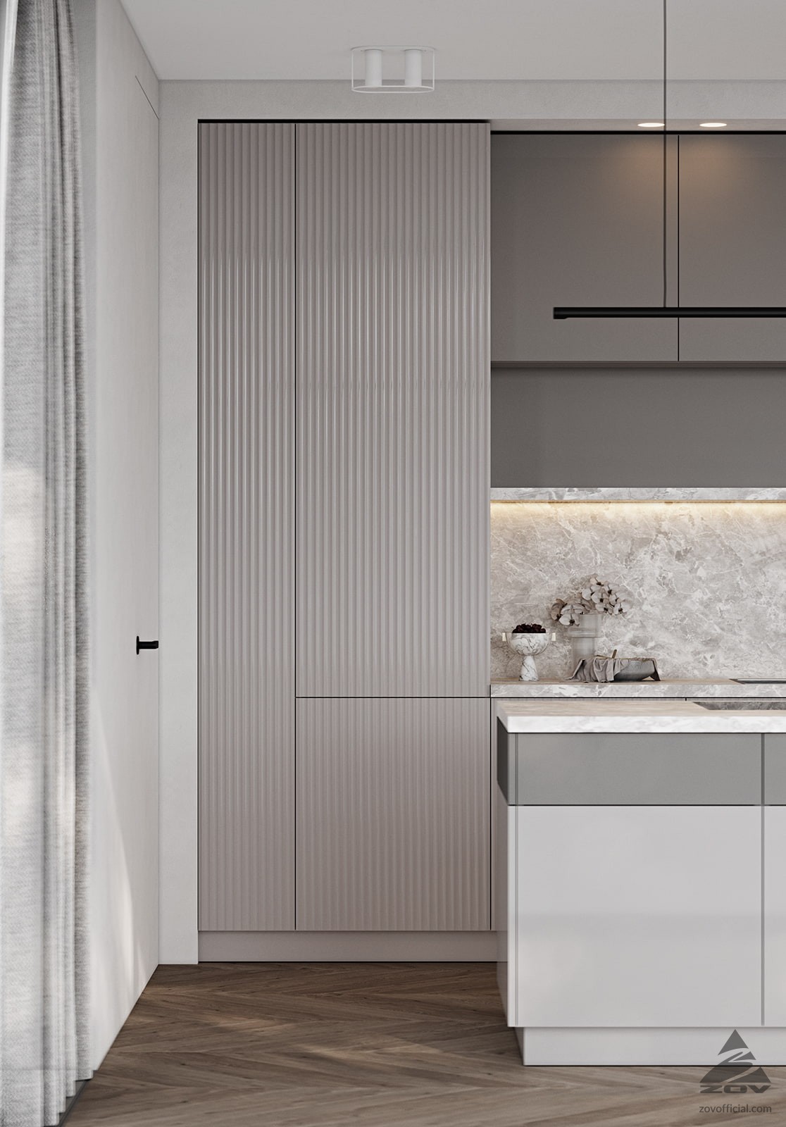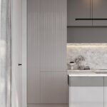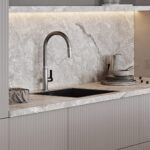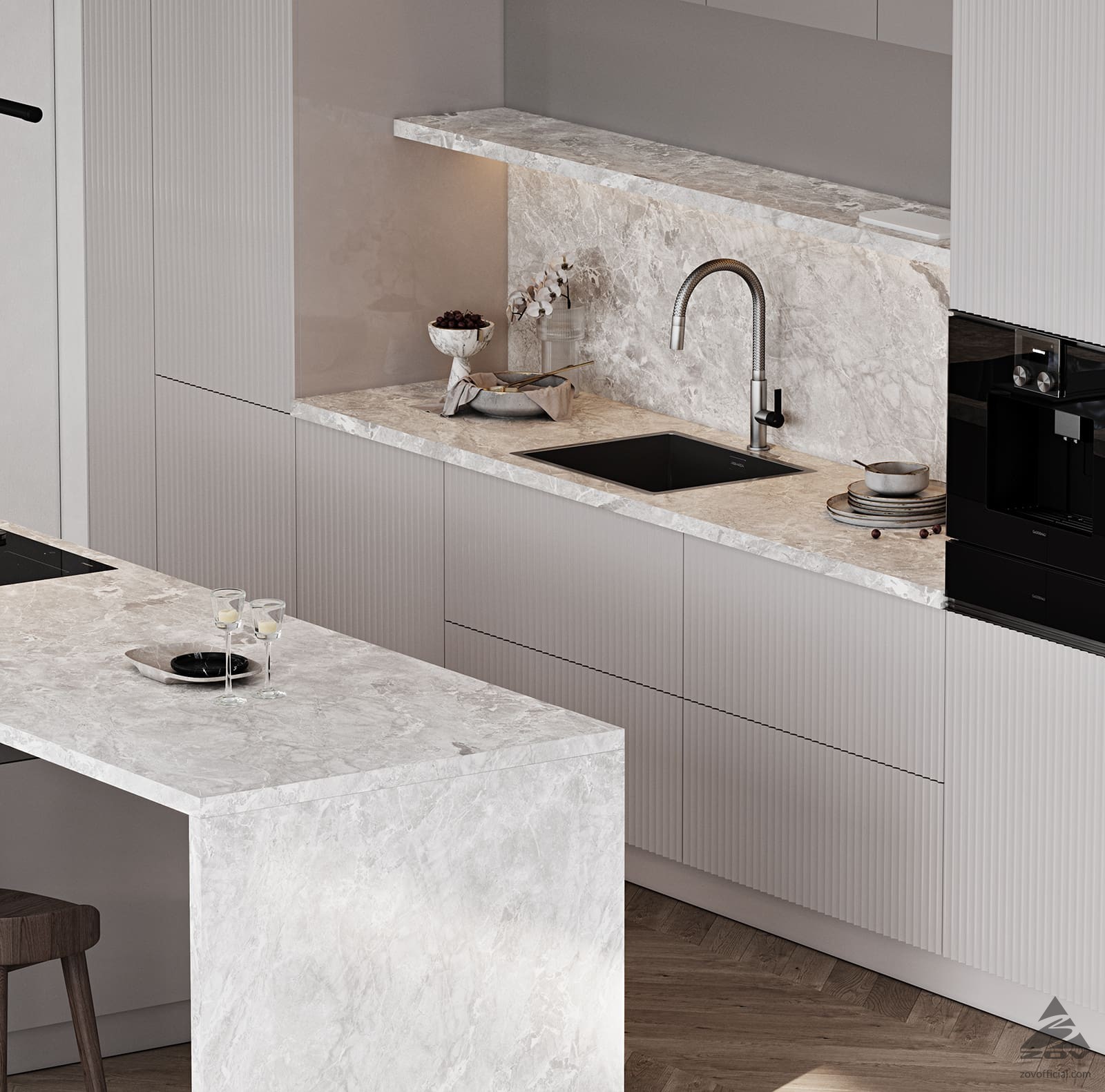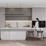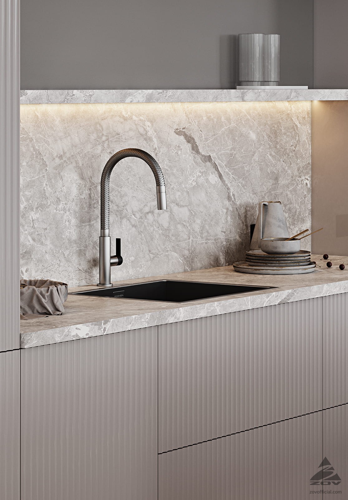 ФАСАДЫ Флавио (крашеная МДФ), цвет NCS S 2002-Y50R Глянец / «Система», цвет NCS S 5005-Y50R Матовый, NCS S 1502-Y50R Глянец СТОЛЕШНИЦА Пластик HPL, 38 мм, декор Римский Камень