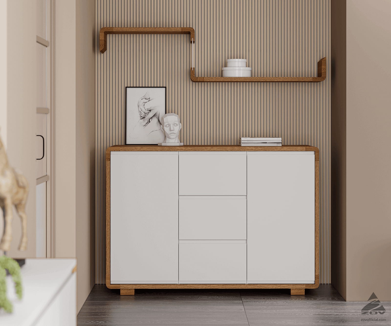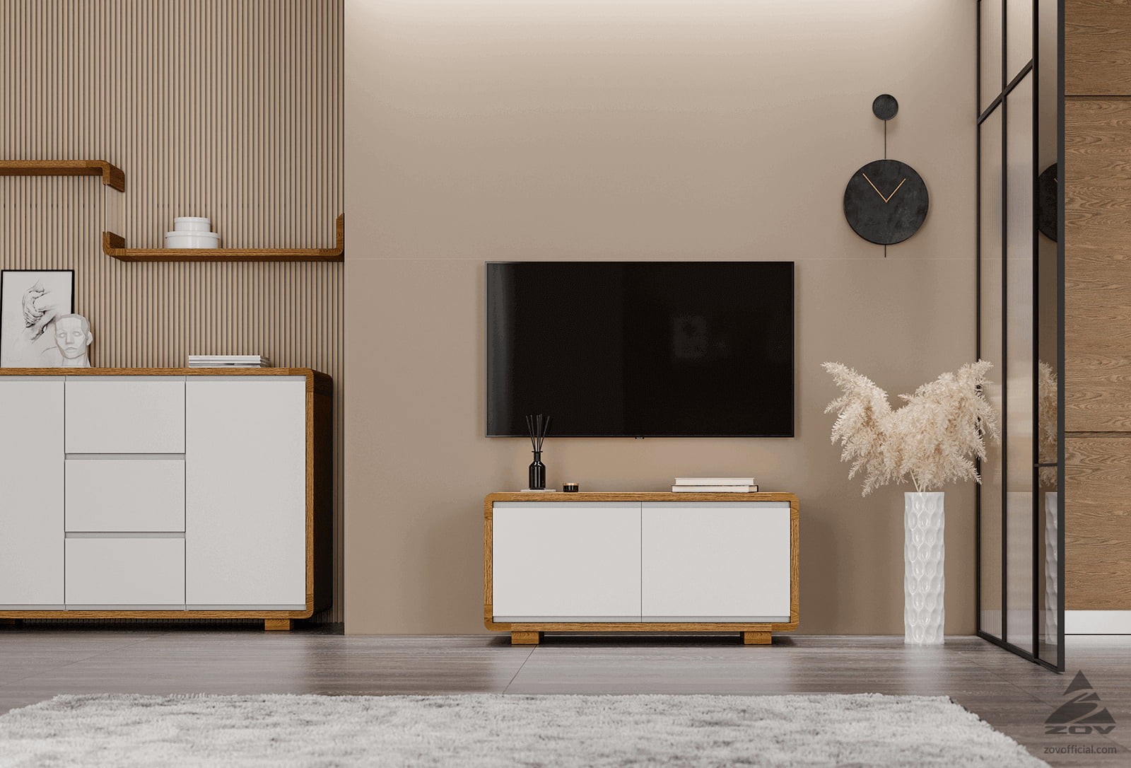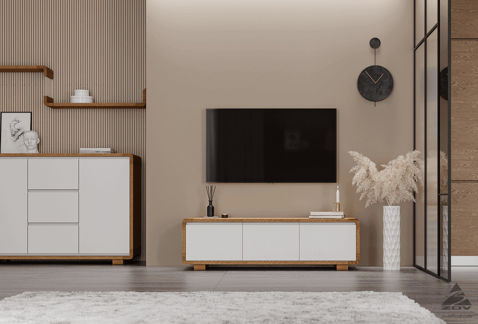 МАТЕРИАЛ Натуральный дуб, шпон дуба, крашеная МДФ (цвет 101 без патины) ВЫДВИЖНЫЕ ЯЩИКИ Направляющие Quadro 25 c доводчиком Silent System ДВЕРИ Петли Sensys с доводчиком Silent System