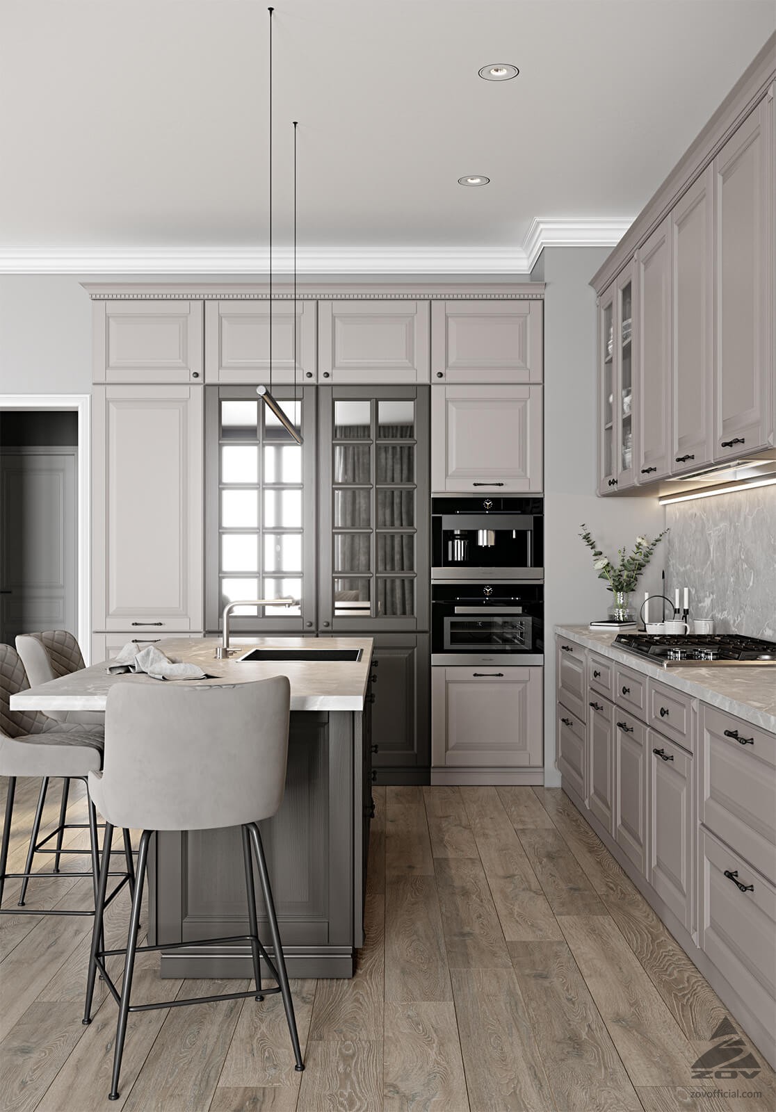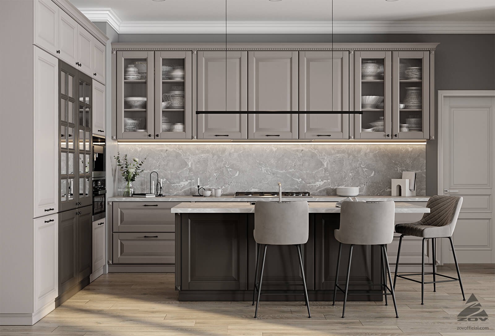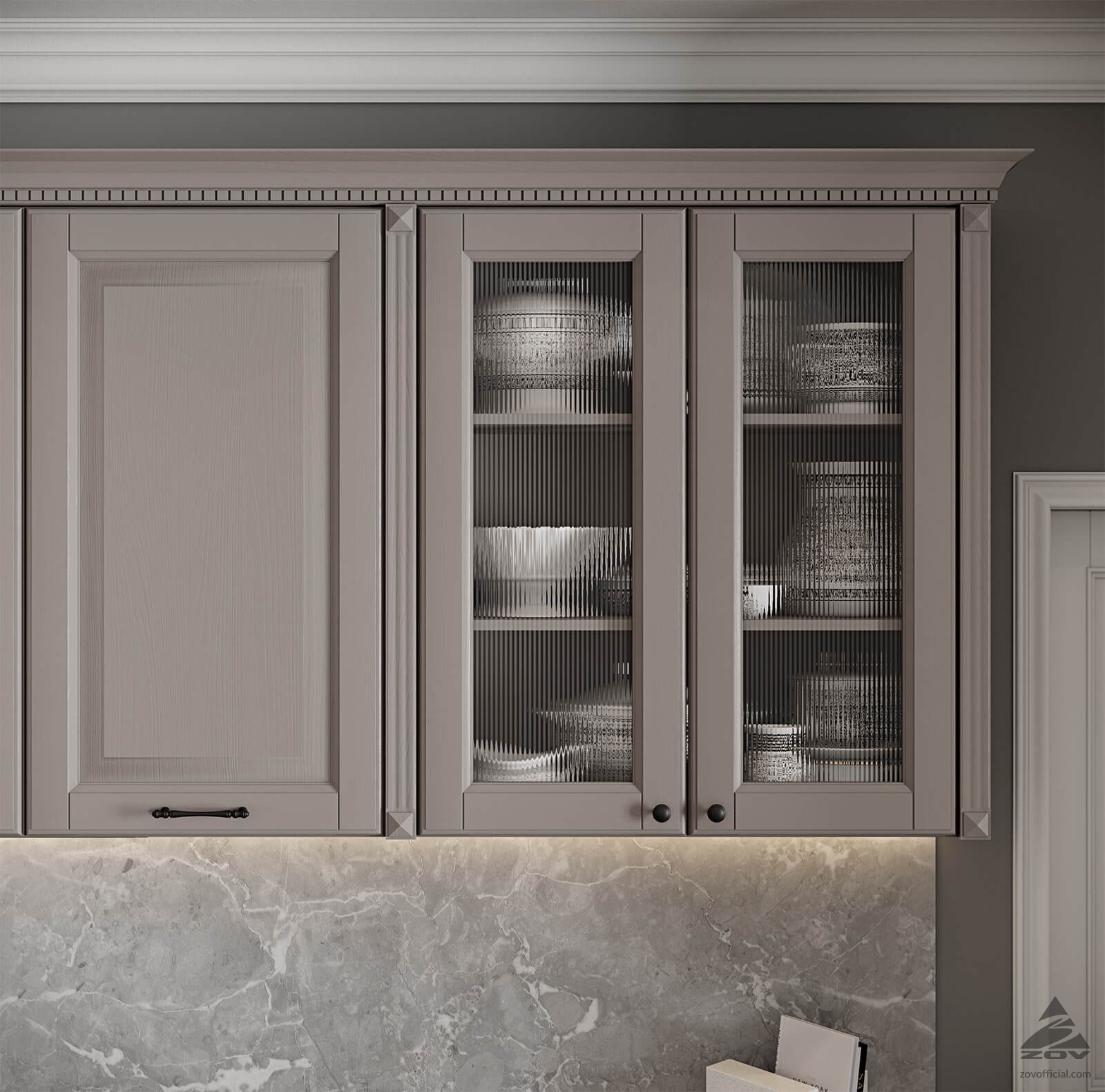 ФАСАДЫ Т506 Натуральный ясень, цвет NCS S 1502-R (без патины) / NCS S 7502-R (без патины) СТОЛЕШНИЦА Пластик HPL, 38 мм, цвет Мрамор Вальмасино Светло-серый