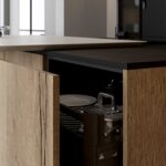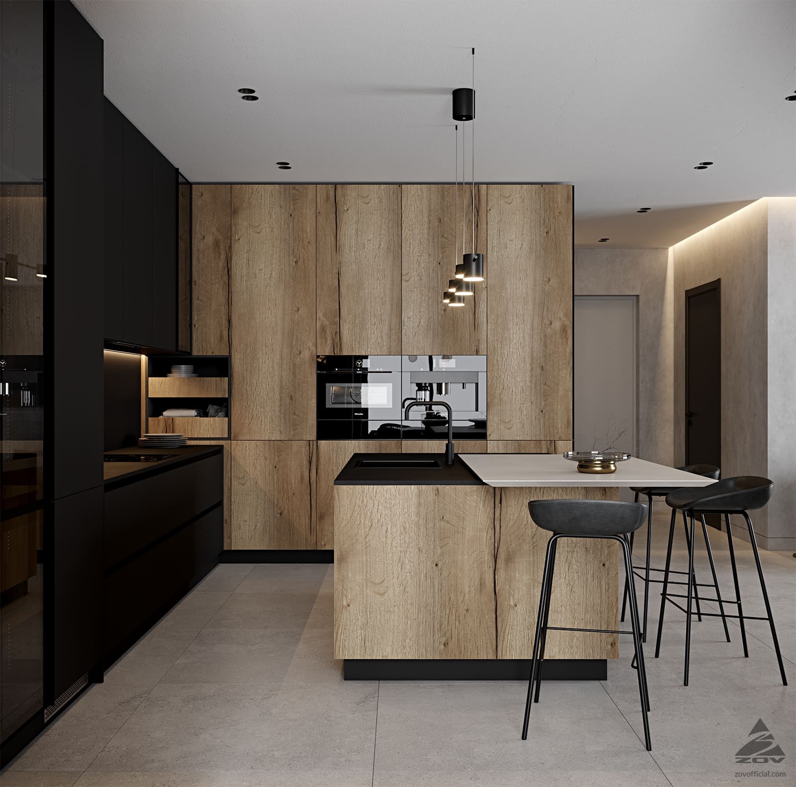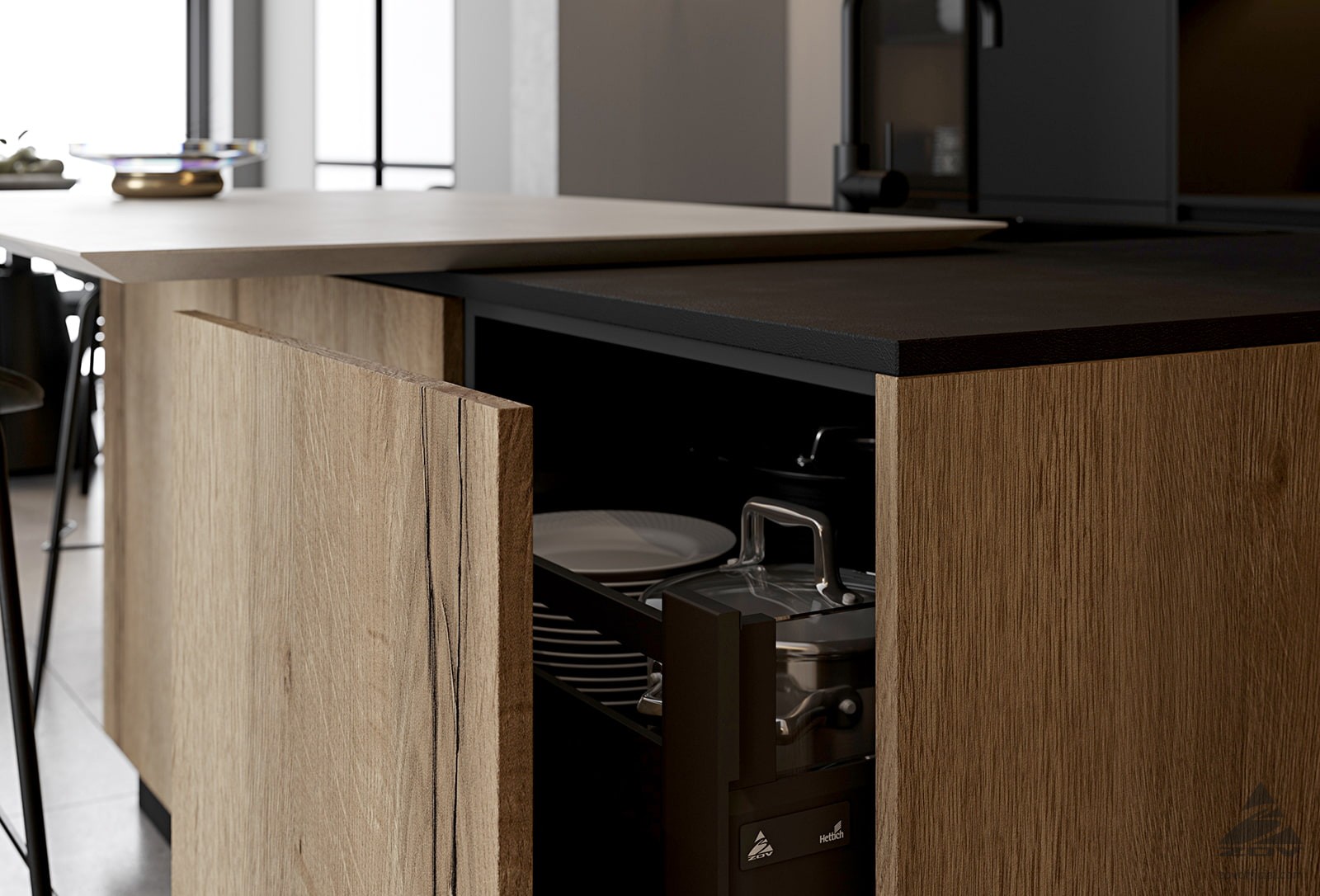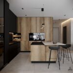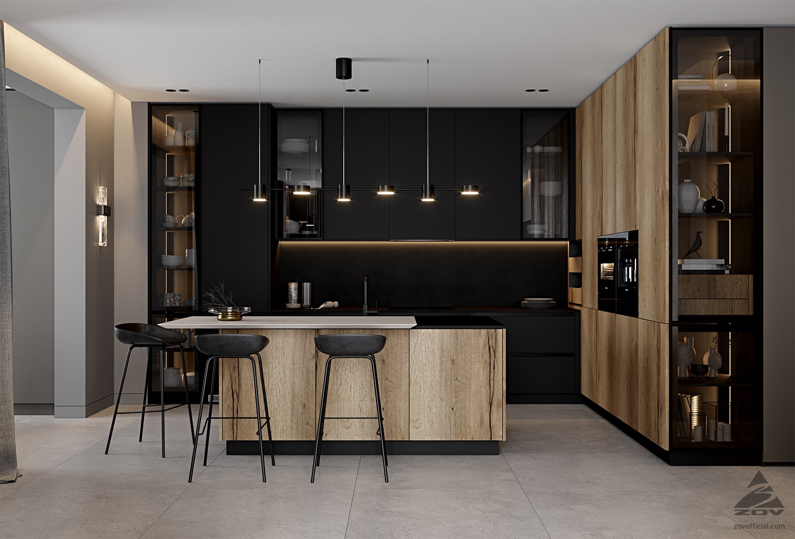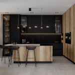 ФАСАДЫ ЛМДФ, цвет Черный Супрамат / ЛДСП Тимбер, декор Галифакс СТОЛЕШНИЦА Пластик HPL, 20 мм, цвет Вулкано / керамогранит, 28 мм, декор Вилма (угол скоса 60˚)