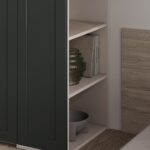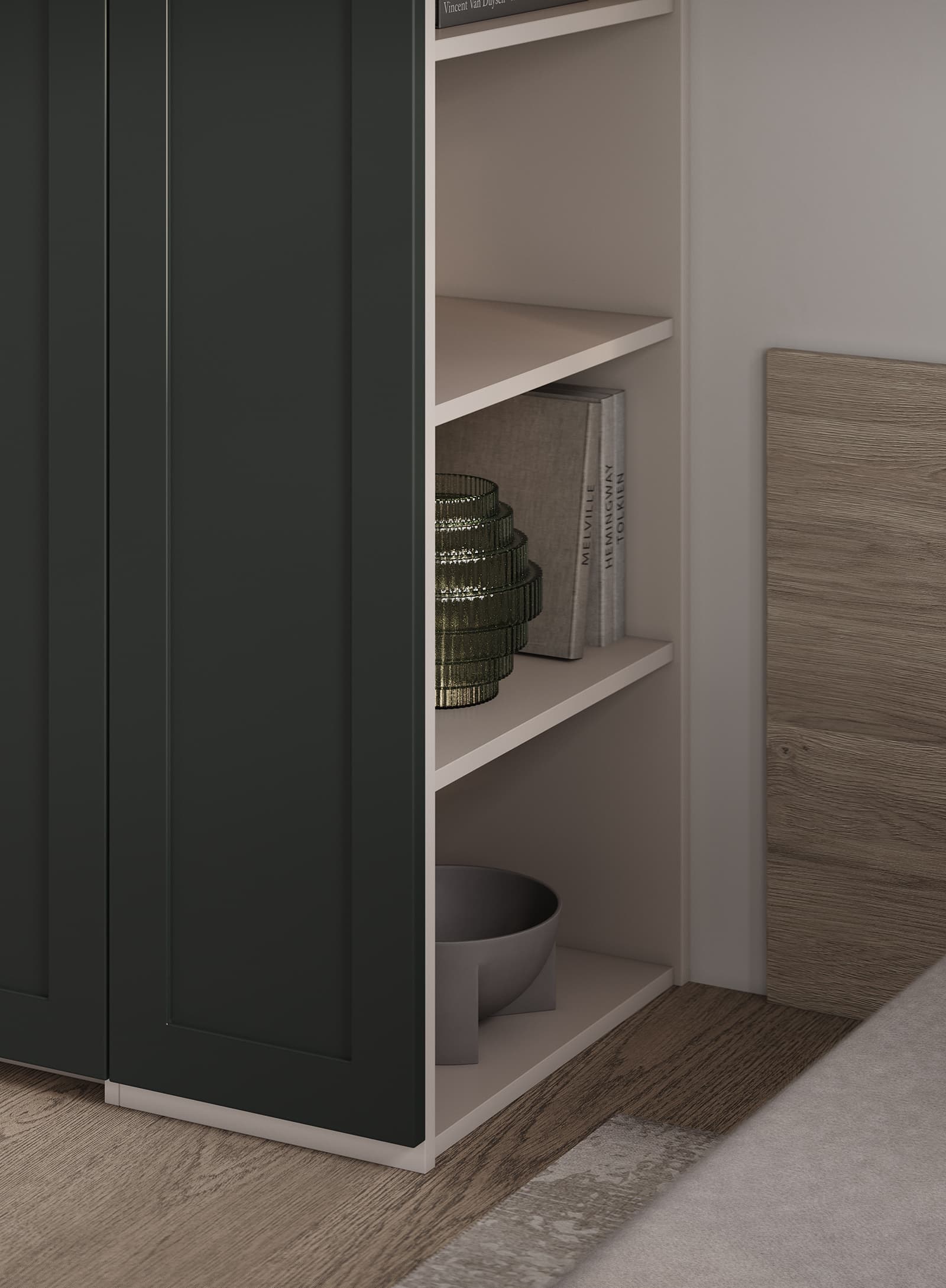 КАРКАС, ПОЛКИ, ВЫДВИЖНЫЕ ЯЩИКИ / ЗАДНЯЯ СТЕНКА ЛДСП Ярко-серый / Белый ФАСАДЫ Ливон (МДФ / ПВХ), цвет Хайленд Грин