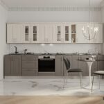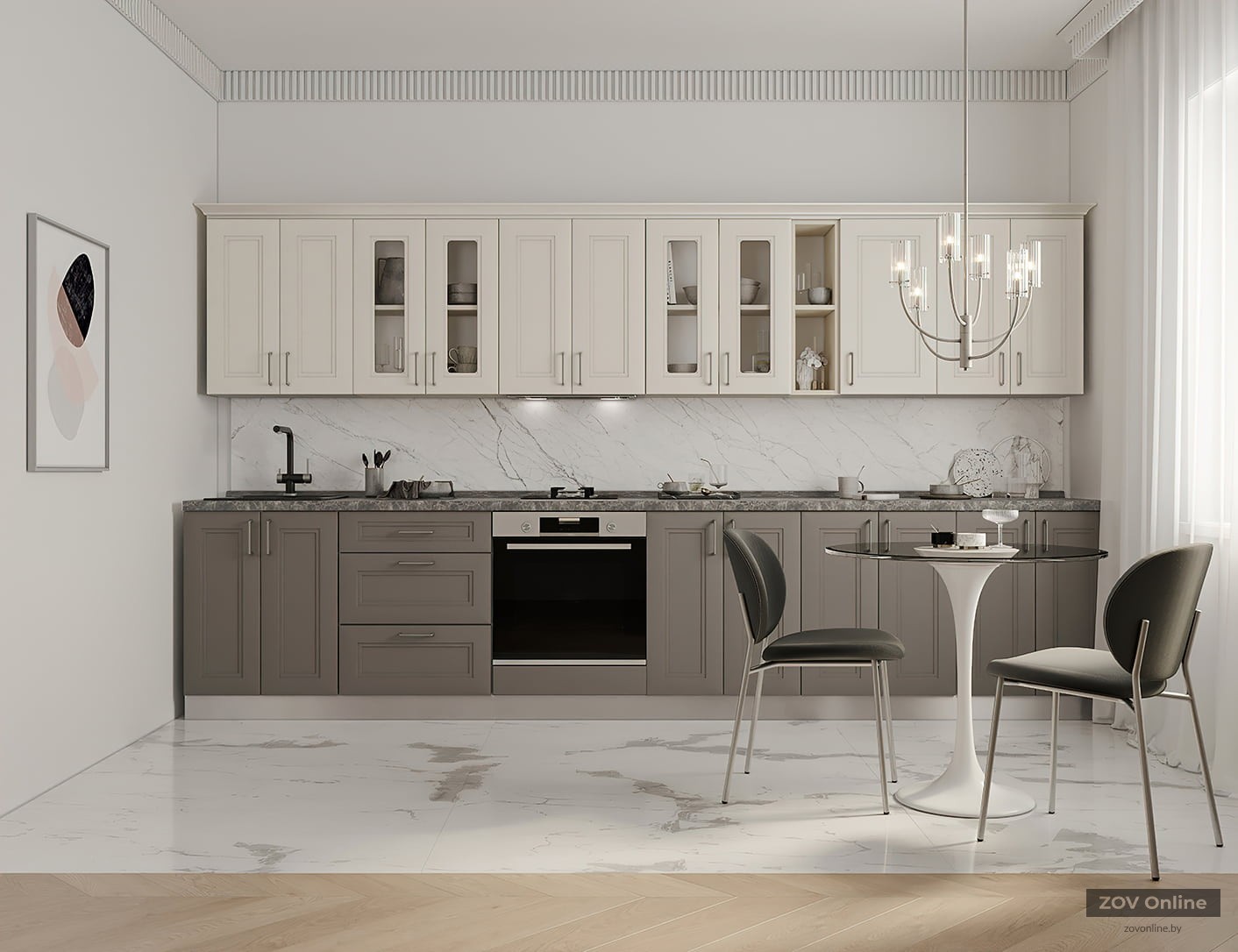 ФАСАДЫ «Эйвон» (МДФ / пленка ПВХ / PET) 19 мм, декор Жасмин PET / Кубанит Серый (Premier Matt) КАРКАСЫ ЛДСП 18 мм, декор Слоновая кость, задняя стенка ДВП 4 мм (цвет Белый) СТОЛЕШНИЦА Пластик HPL 38 мм, декор Гранит Рокфорд (постформинг); пристеночный бортик в цвет + заглушки