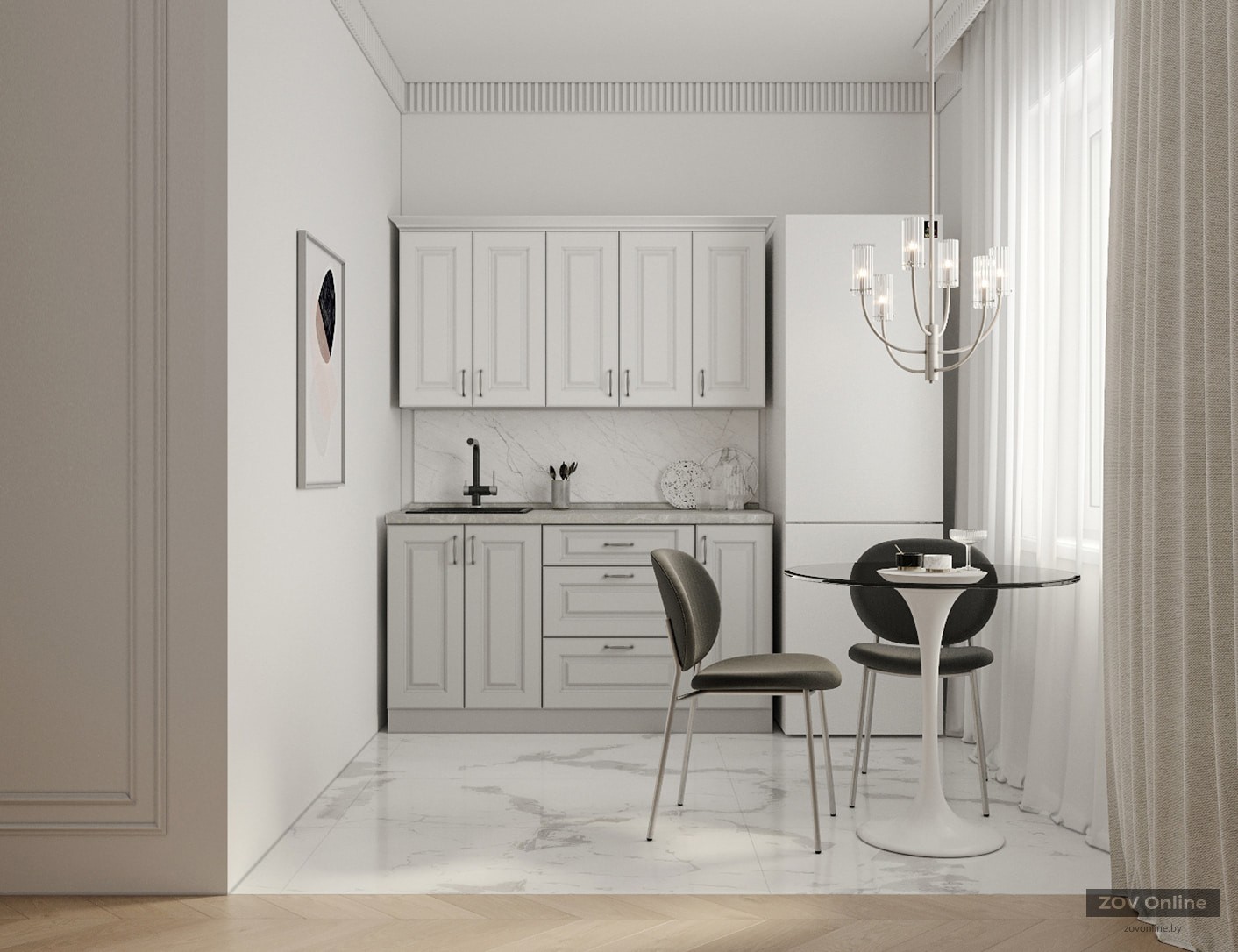 ФАСАДЫ «Лонгфорд» (МДФ / пленка ПВХ) 19 мм, декор Белый Супермат / Сильвер КАРКАСЫ ЛДСП 18 мм, декор Белый Премиум, задняя стенка ДВП 4 мм (цвет Белый) СТОЛЕШНИЦА Пластик HPL 38 мм, декор Мрамор Вальмасино Светло-серый (постформинг); пристеночный бортик в цвет + заглушки