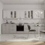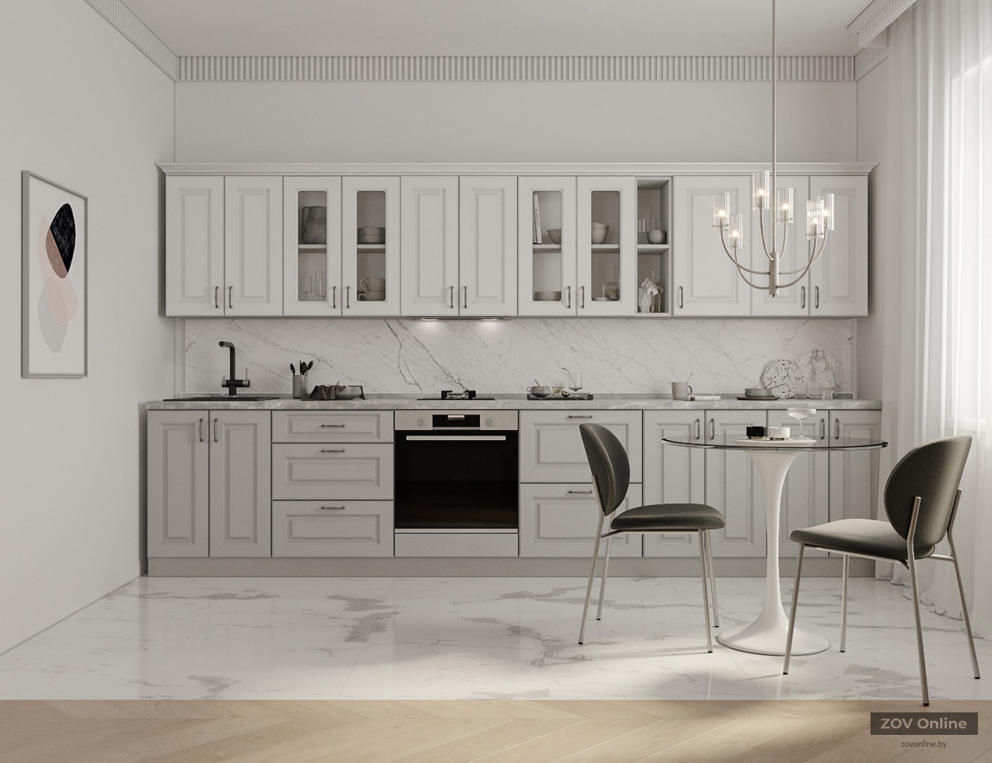 ФАСАДЫ «Лонгфорд» (МДФ / пленка ПВХ) 19 мм, декор Белый Супермат / Сильвер КАРКАСЫ ЛДСП 18 мм, декор Белый Премиум, задняя стенка ДВП 4 мм (цвет Белый) СТОЛЕШНИЦА Пластик HPL 38 мм, декор Мрамор Вальмасино Светло-серый (постформинг); пристеночный бортик в цвет + заглушки