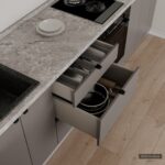 ФАСАДЫ «Система» (МДФ / пленка ПВХ) 19 мм, декор Галифакс Белый / Кубанит Серый (Premier Matt) КАРКАСЫ ЛДСП 18 мм, декор Ярко-серый, задняя стенка ДВП 4 мм (цвет Белый) СТОЛЕШНИЦА Пластик HPL 38 мм, декор Римский Камень (постформинг); пристеночный бортик в цвет + заглушки