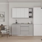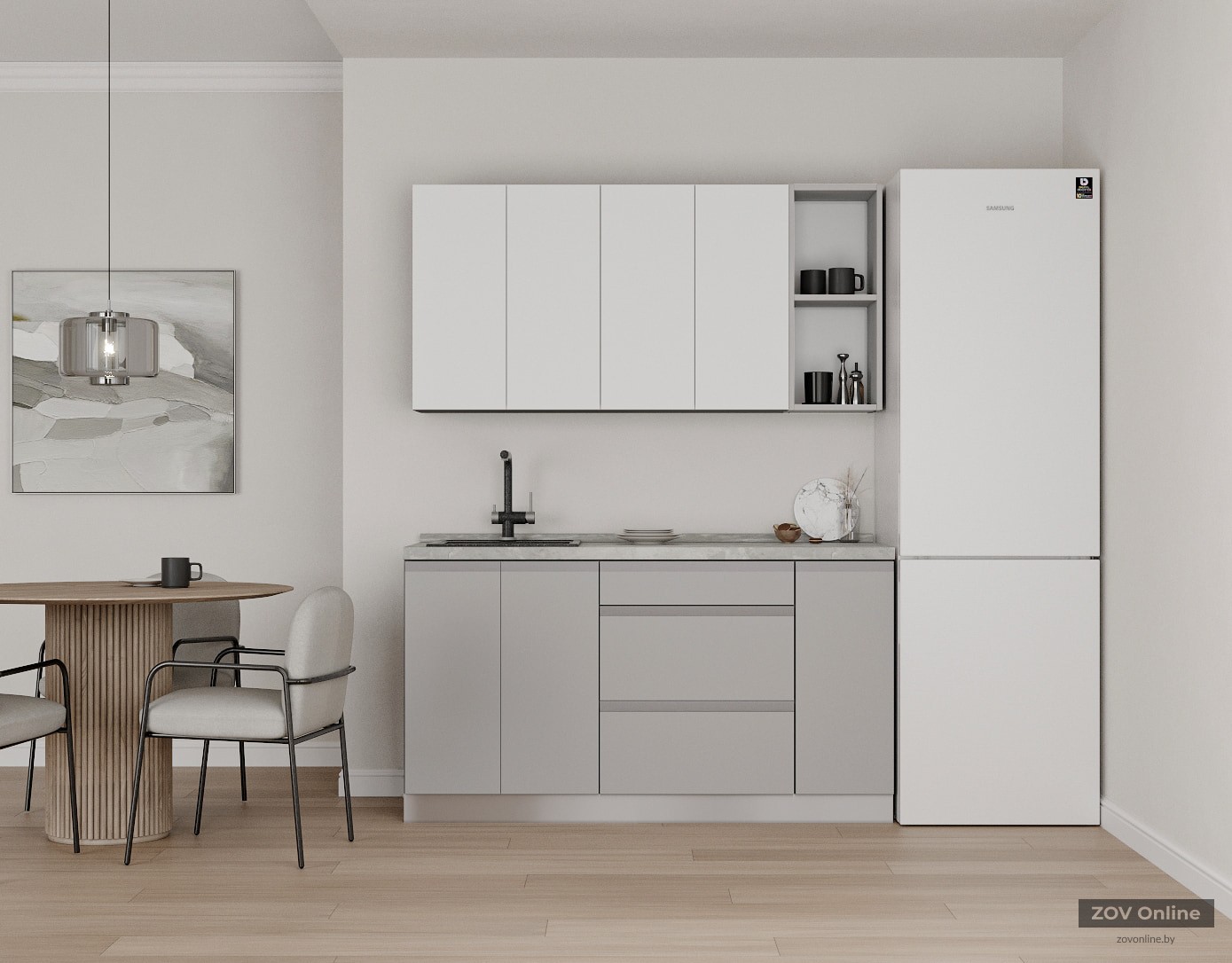 ФАСАДЫ «Система» (МДФ / пленка ПВХ) 19 мм, декор Белый Супермат / Сильвер КАРКАСЫ ЛДСП 18 мм, декор Серый Камень, задняя стенка ДВП 4 мм (цвет Белый) СТОЛЕШНИЦА Пластик HPL 38 мм, декор Мрамор Вальмасино Светло-серый (постформинг); пристеночный бортик в цвет + заглушки