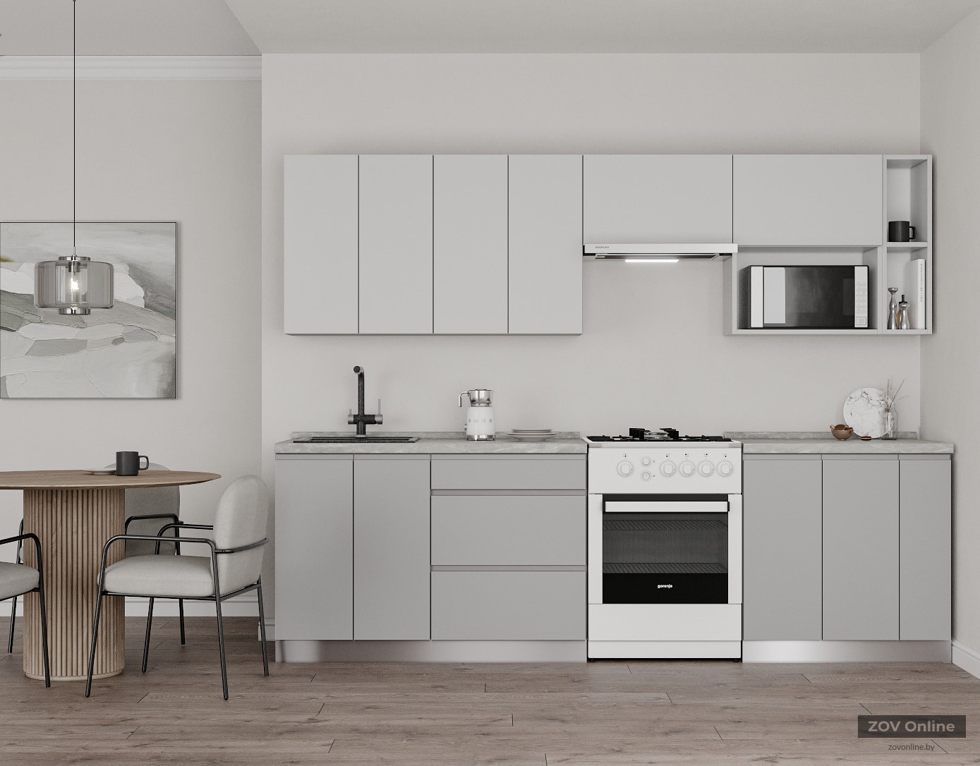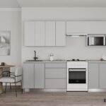 ФАСАДЫ «Система» (МДФ / пленка ПВХ) 19 мм, декор Белый Супермат / Сильвер КАРКАСЫ ЛДСП 18 мм, декор Серый Камень, задняя стенка ДВП 4 мм (цвет Белый) СТОЛЕШНИЦА Пластик HPL 38 мм, декор Мрамор Вальмасино Светло-серый (постформинг); пристеночный бортик в цвет + заглушки