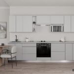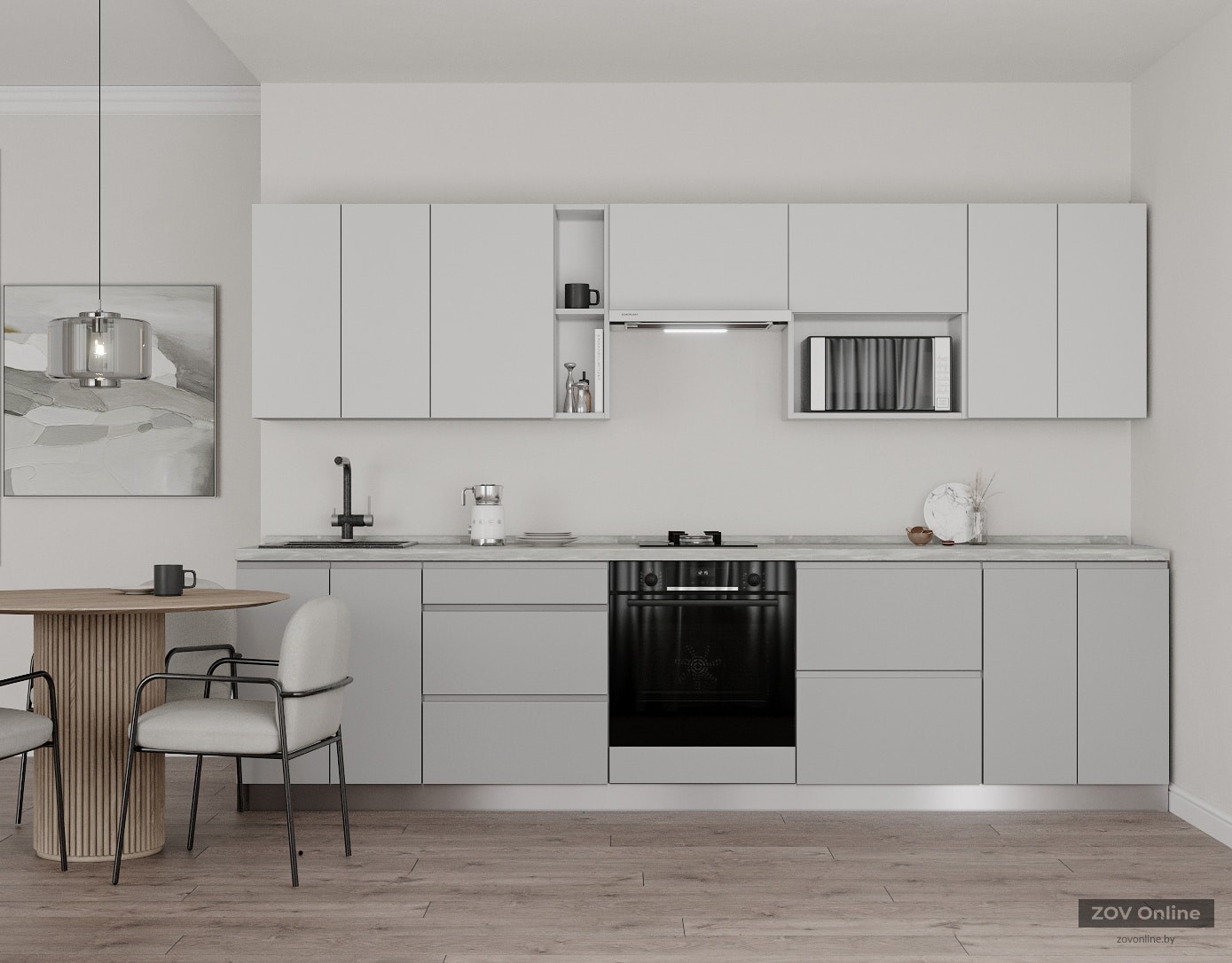 ФАСАДЫ «Система» (МДФ / пленка ПВХ) 19 мм, декор Белый Супермат / Сильвер КАРКАСЫ ЛДСП 18 мм, декор Серый Камень, задняя стенка ДВП 4 мм (цвет Белый) СТОЛЕШНИЦА Пластик HPL 38 мм, декор Мрамор Вальмасино Светло-серый (постформинг); пристеночный бортик в цвет + заглушки