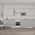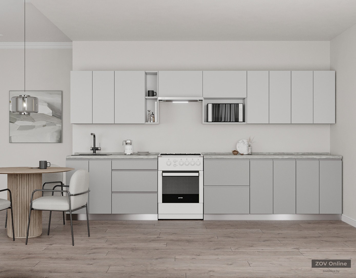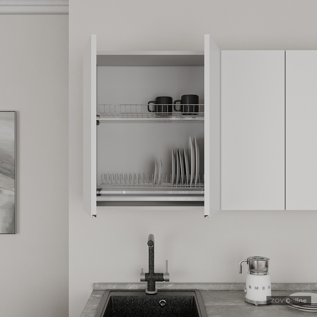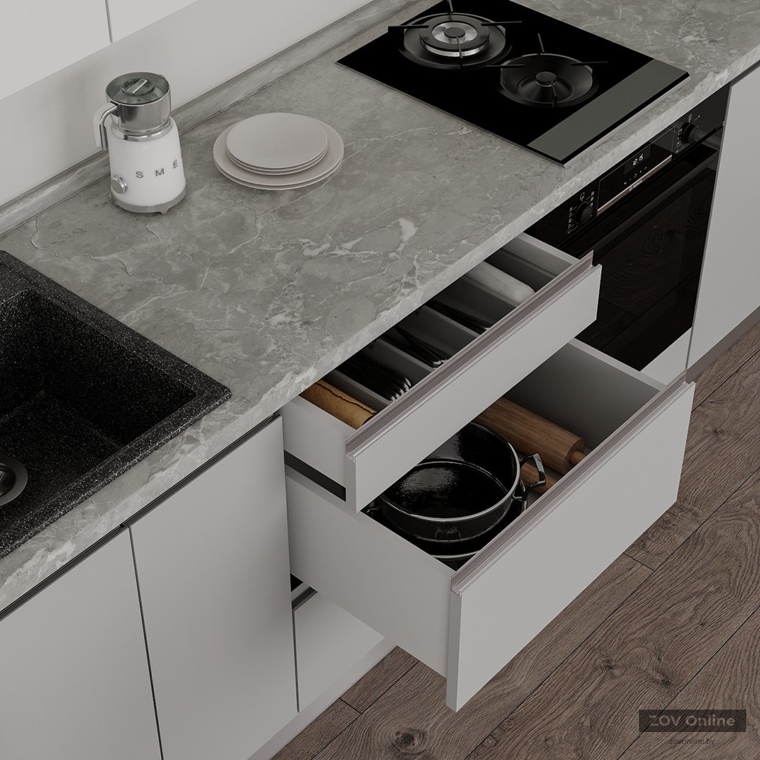 ФАСАДЫ «Система» (МДФ / пленка ПВХ) 19 мм, декор Белый Супермат / Сильвер КАРКАСЫ ЛДСП 18 мм, декор Серый Камень, задняя стенка ДВП 4 мм (цвет Белый) СТОЛЕШНИЦА Пластик HPL 38 мм, декор Мрамор Вальмасино Светло-серый (постформинг); пристеночный бортик в цвет + заглушки