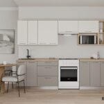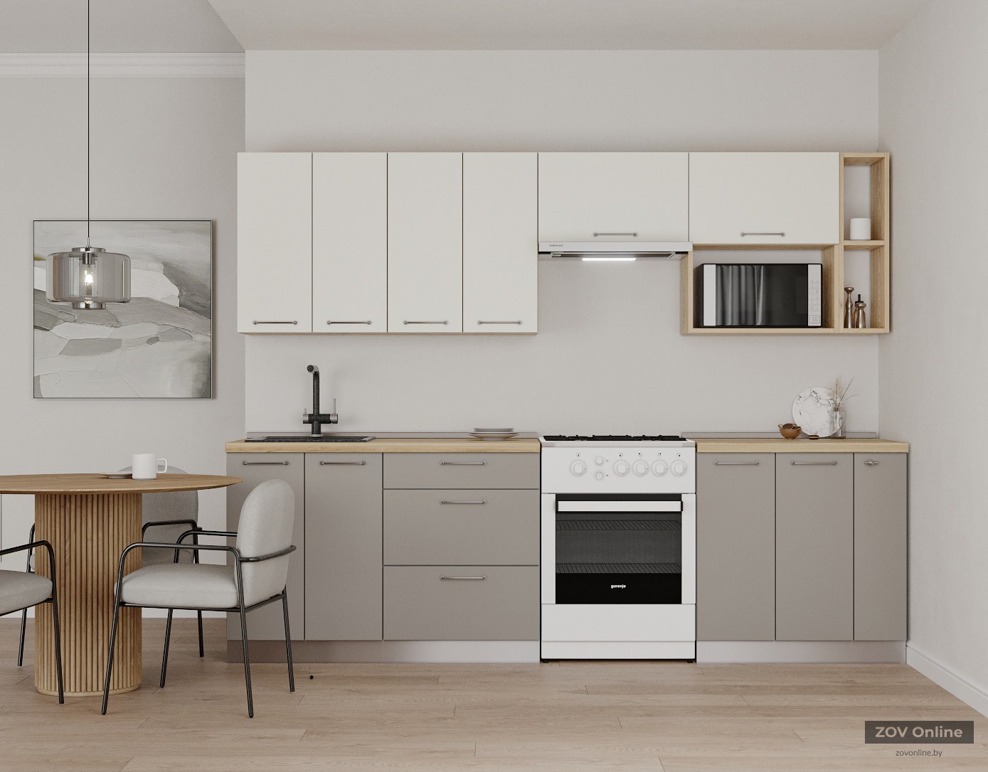 ФАСАДЫ «Система» (МДФ / пленка ПВХ) 19 мм, декор Античный Белый / Теплый Серый КАРКАСЫ ЛДСП 18 мм, декор Каштан Песочный, задняя стенка ДВП 4 мм (цвет Белый) СТОЛЕШНИЦА Пластик HPL 38 мм, декор Поло; пристеночный бортик, цвет Алюминий + заглушки