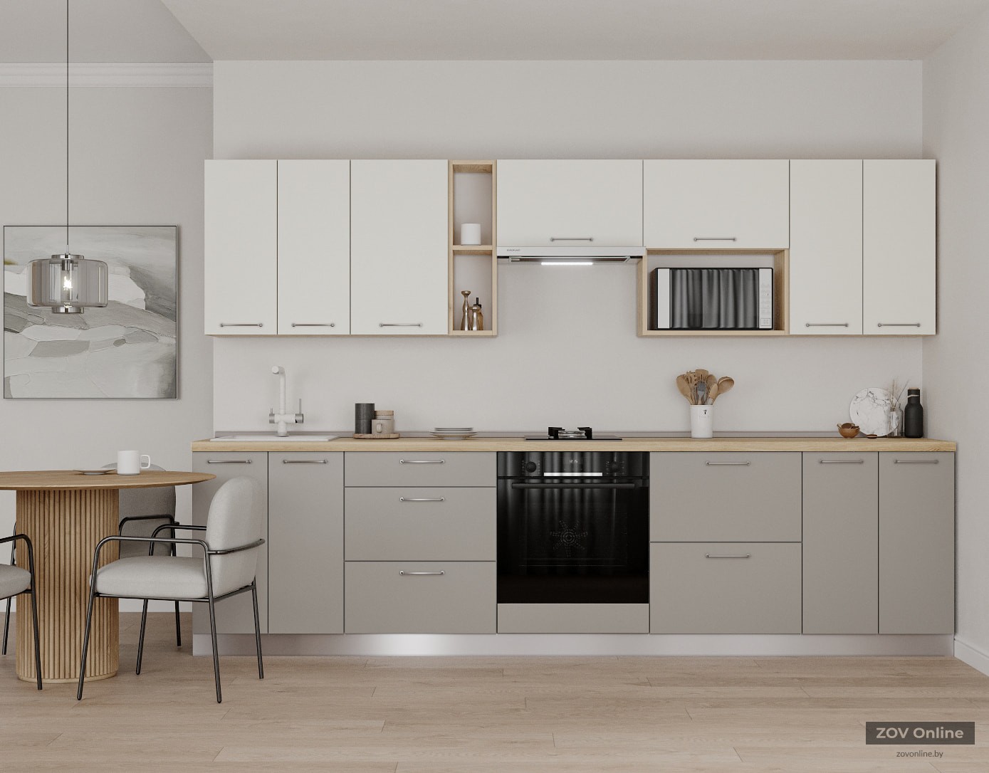 ФАСАДЫ «Система» (МДФ / пленка ПВХ) 19 мм, декор Античный Белый / Теплый Серый КАРКАСЫ ЛДСП 18 мм, декор Каштан Песочный, задняя стенка ДВП 4 мм (цвет Белый) СТОЛЕШНИЦА Пластик HPL 38 мм, декор Поло; пристеночный бортик, цвет Алюминий + заглушки
