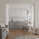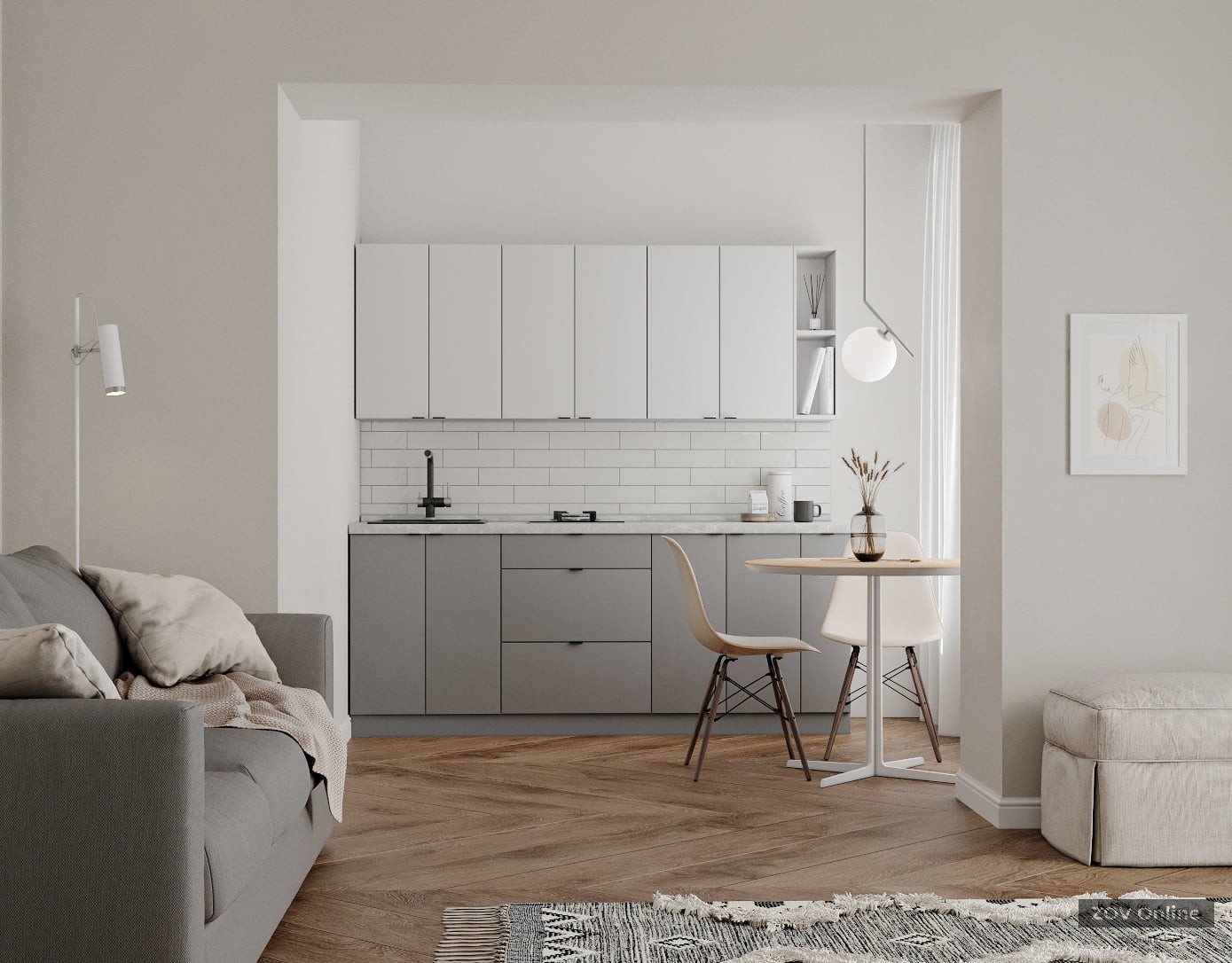 ФАСАДЫ ЛДСП 18 мм, декор Серый Камень / Серый Пыльный КАРКАСЫ ЛДСП 18 мм, декор Серый Камень, задняя стенка ДВП 4 мм (цвет Белый) СТОЛЕШНИЦА Пластик HPL 38 мм, декор Мрамор Вальмасино Светло-серый (постформинг); пристеночный бортик в цвет + заглушки