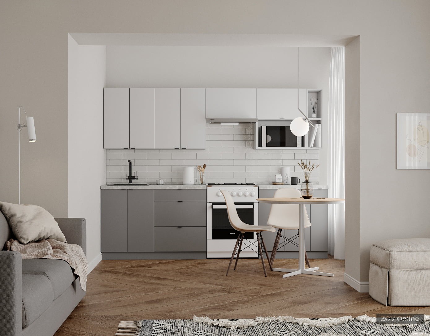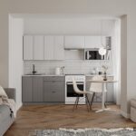 ФАСАДЫ ЛДСП 18 мм, декор Серый Камень / Серый Пыльный КАРКАСЫ ЛДСП 18 мм, декор Серый Камень, задняя стенка ДВП 4 мм (цвет Белый) СТОЛЕШНИЦА Пластик HPL 38 мм, декор Мрамор Вальмасино Светло-серый (постформинг); пристеночный бортик в цвет + заглушки