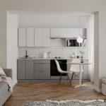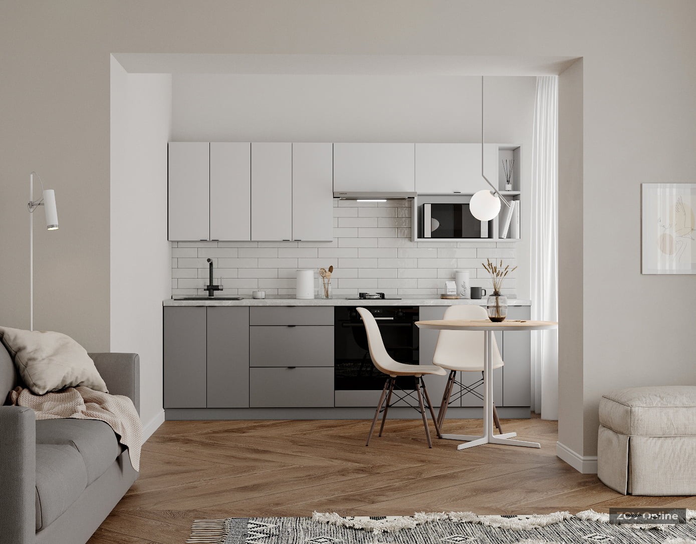 ФАСАДЫ ЛДСП 18 мм, декор Серый Камень / Серый Пыльный КАРКАСЫ ЛДСП 18 мм, декор Серый Камень, задняя стенка ДВП 4 мм (цвет Белый) СТОЛЕШНИЦА Пластик HPL 38 мм, декор Мрамор Вальмасино Светло-серый (постформинг); пристеночный бортик в цвет + заглушки