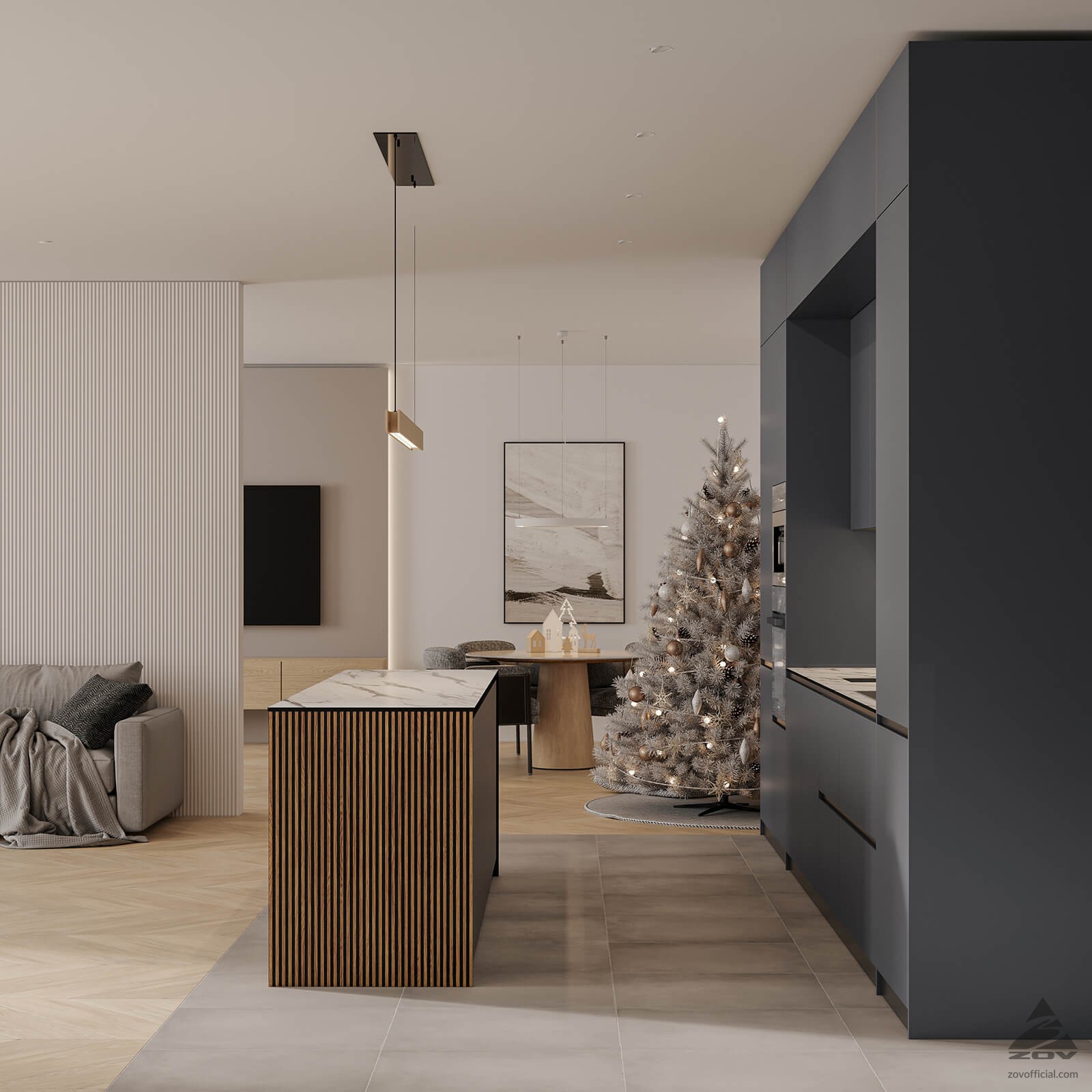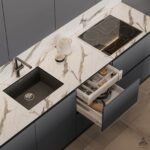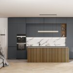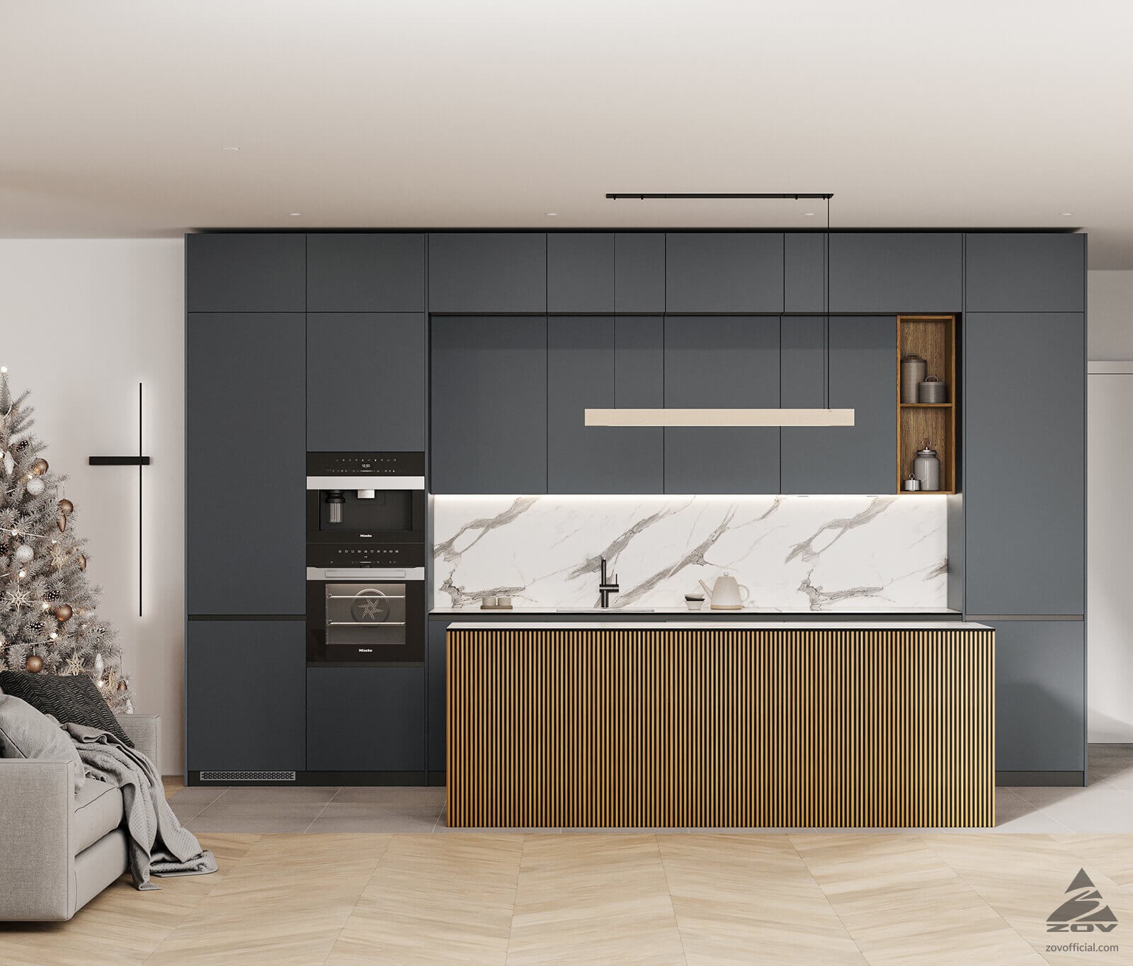 ФАСАДЫ T234 МДФ / шпон ясеня, цвет #111 Черная патина / акрил Fenix NTM, цвет Серо-синий NTM (0724) СТОЛЕШНИЦА Компакт-плита, 12 мм, декор Мрамор Арабеск