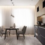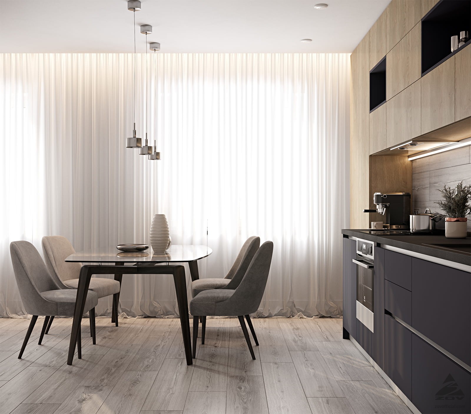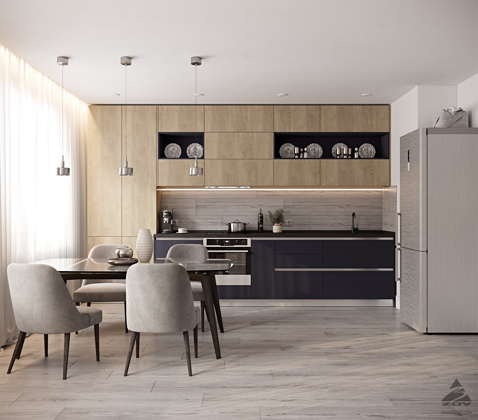 ФАСАДЫ ЛДСП Тимбер, цвет Сабиа / Крашеная МДФ, цвет NCS S 7010-R70B Матовый СТОЛЕШНИЦА Пластик HPL, 38 мм, цвет Вулкано