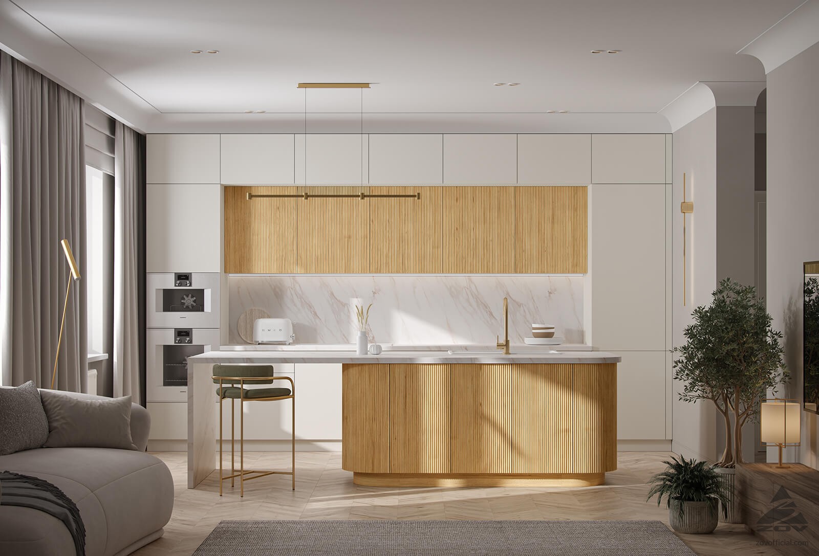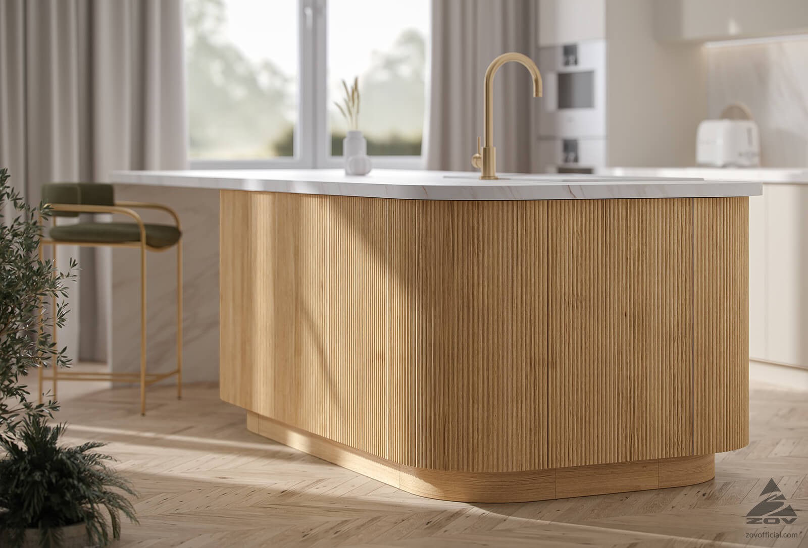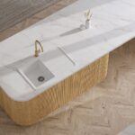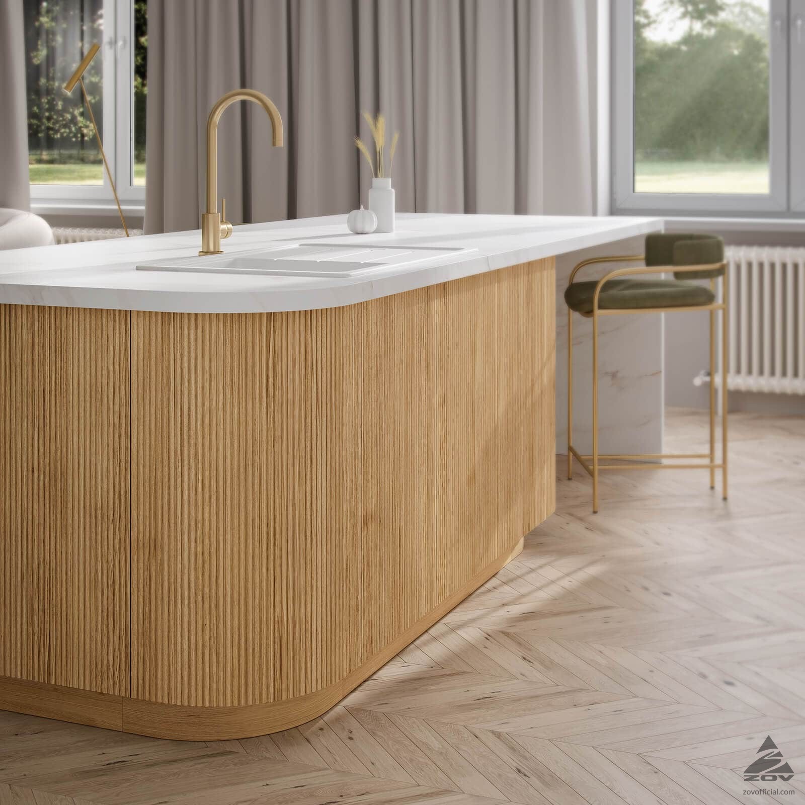 ФАСАДЫ T430 МДФ / массив дуба, цвет #154 Natur / пластик HPL, цвет Бьянко СТОЛЕШНИЦА Пластик HPL, 38 мм, декор Энцо